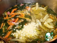 За 2-3 минуты до конца варки добавляем в суп чеснок, солим и перчим. |