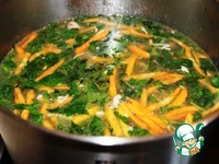 В бульон к картофелю отправляем тушеные со шпинатом овощи, куриное мясо и доводим до кипения. |