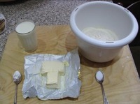 Подготовленные продукты. Просеянная мука, охлажденный маргарин, охлажденный кефир, соль, сода. |
