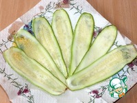 Кабачки, не очищая, нарезать длинными тонкими полосками и слегка обжарьте на оливковом масле, на разогретой сковороде. Не солим! |