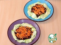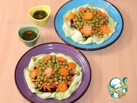 Затем выложить зеленый горошек, полить оставшейся заправкой и украсить листьями мяты и небольшими ломтиками моркови. |