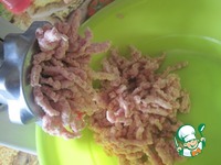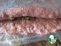 Добавляем к мясу яйцо, соль, перец перемешиваем и выкладываем прямоугольником на пакет |