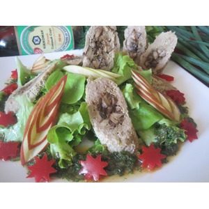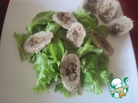 Описание: У салата насыщенный вкус, который складывается из мясного рулета с грибами со свежими овощами и яблоком, дополняющий заправкой. Приготовив его вся семья будет наслаждаться вкусом и запахом салата.