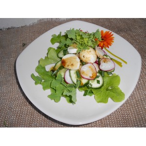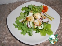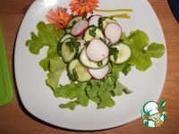 На салатные листья выложить редис, огурец и зеленый лук. Моцареллу нарезать кружочками и выложить на овощи. |