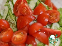 2. Салат порвать руками. помидор и огурец нарезать произвольно, выложить в чашку. |