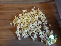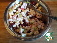 Яблоко режем следующим образом: от верхней части отрезаем округлую верхушку и 3-4 тонких ломтика (это для подачи). Смазываем их лимонным соком - чтобы не потемнели нижнюю часть режем мелким кубиком |