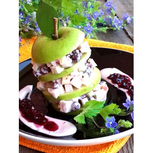 Ломтики яблока выкладываем на тарелку, переслаивая их салатом. Вот и все! Немного соуса помещаем рядом на тарелке, украшаем брусничным вареньем. На яблоке делам "хвостик" и листочек по желанию |