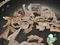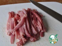 Слегка оттаявшую свинину режем тонкими полосками. Можно брать куриное филе, но блюдо будет посуше. |