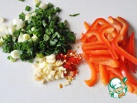 Мелко рубим чеснок и красный жгучий перец. Красный болгарский перец режем тонкими полосками. Зелёный лук вместе с белой частью режем колечками. |