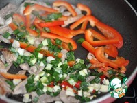 Кладём к свинине болгарский перец, зелёный лук и чеснок. Перемешиваем. |