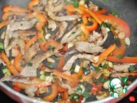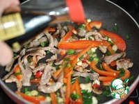 Добавляем соевый соус к свинине с овощами, перемешиваем. |