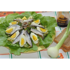 Сверху выложить четвертинки яиц, почищенную и разрезанную на филе кильку. Сбрызнуть остатками соуса. |