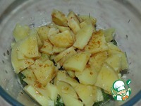 Картошку смешать с зеленью и большей частью заправки. Хорошенько, но аккуратно перемешать. |