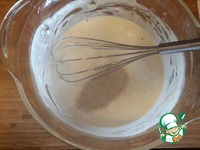 В теплую воду добавить 4 ст. л. муки, щепотку сахара и дрожжи, размешать венчиком и оставить на 20 минут для подъема |