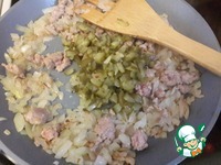 Как только сырой цвет фарша исчезнет, добавляем нарезанный мелко маринованный огурчик, продолжаем обжаривать ещё 5 минут |