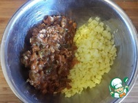 Вливаем сок к начинке на сковороде и на сильном огне тушим около 5-8 минут, чтобы сок слегка выпарился. Снимаем с огня, добавляем сахар, соль и специи, перемешиваем и остужаем. |