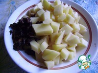 Пока тушатся овощи картофель нарезаем кубиками. Грибы отжимаем и нарезаем мелко. Воду в которой замачивались грибы добавляем в бульон. Туда же кидаем картошку и грибы. |