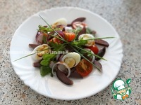 Описание: Очень вкусное сочетание утиных желудочков с руколой и овощами под заправкой с добавлением соевого соуса! Элегантный, яркий салатик!