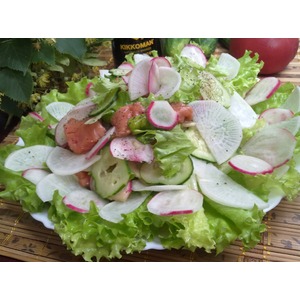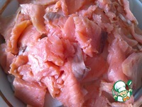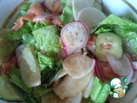 Овощи выложить в миску, сверху выложить ломтики слабосоленой горбуши. |