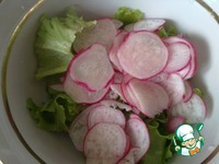 Помыть и обсушить листья салата. Крупно порвать руками. Блендером измельчить редис. В миску к листьям салата добавляем редис. Чтобы удобно было мешать салат, миску возьмите побольше, |