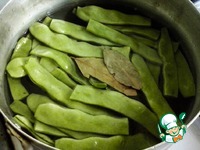Стручки я разрезала по полам, что бы удобнее было сварить. В воду добавила 2 лавровых листа и соль. После кипения проварить 10 минут. Слить воду. |