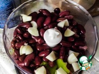 Делаем заправку. Перец болгарский нарезаем. Добавляем фасоль консервированную, чеснок 3 зубчика ( его порезала на кусочки по меньше). Взбиваем в блендере. |