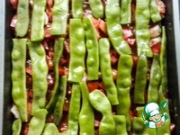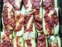 Разогреваем духовку до 180 градусов. Смазываем форму оливковым маслом. Цукини укладываем на дно. Сверху приправляем фасолевой заправкой. |