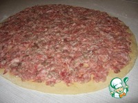 Расскатываем тесто не очень тонко и выкладываем на него фарш. Можно добавить лук. Соль специи по вкусу! |