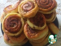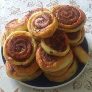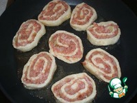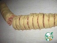 Скручиваем тесто с фаршем в рулетик и нарезаем на кусочки примерно 1-1,5см |