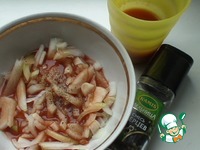 Не большую головку репчатого лука нарезаем полу колечками. Томатный сок, если нет соковыжималки сделаем сами. Спелые помидоры протереть через сито. Полученный сок добавить к луку и поперчить. |