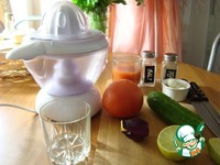 Берём продукты для приготовления сока. Из одного крупного помидора жмём сок. Нам нужно 100 мл. Лайм режем пополам, чтобы выжать из половинки сок для гаспачо. |