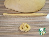 7. Смазываем стол и руки растительным маслом и начинаем формовать крендельки. Отщипываем небольшой кусочек теста, раскатываем колбаску длиной 27 см, диаметр 2 см. и скручиваем кренделек. |