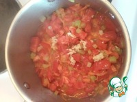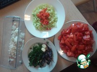 Подготовим все продукты: нарежем мелко сельдерей, перец болгарский, зелень и помидоры. Нашинкуем лук репчатый, почистим чеснок |