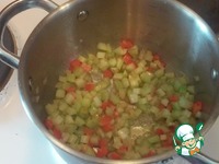 Посируем в кастрюле лук репчатый на смеси сливочного и оливкового масла до золотистого цвета. Добавляем сельдерей и перец болгарский, немного потушим, чтобы размягчились. |