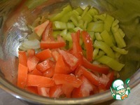 Помидоры и болгарский перец порезать соломкой. Положить в кастрюлю вместе с обжаренным луком. |