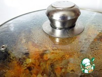 Ну и последний штрих - вливаем заправку к желудочкам, солим, перчим по вкусу, аккуратно всё перемешиваем, накрываем крышкой и тушим на медленном огне около 5 мин. |