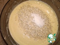 Введём овсяные хлопья и разрыхлитель для теста. Перемешаем. |