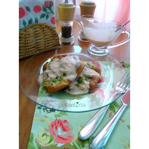 Накрыла стол. На тарелки выложила по 3 оладушка и каждый полила соусом. |