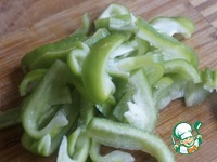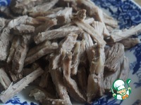 Отварную говядину остудить, убрать лишний жир и нарезать небольшими брусочками. |