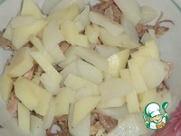 Картофель отварить, остудить и очистить. Картофель порезать также небольшими кусочками. Добавить картофель к мясу. |