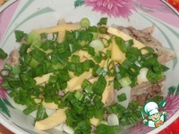 Зеленый лук промыть водой и порезать. Добавить в салат. |