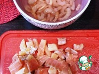 Сёмгу режем средним кубиком. Креветки заливаем горячей водой, через минуту воду сливаем и повторяем процедуру раза 2 что бы креветки полностью разморозить. |