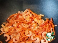 Сёмгу и креветки добавляем к овощам. Немного посолим. Готовим пока рыбка не изменит цвет. Помешиваем очень аккуратно, что бы не превратить кусочки сёмги в рыбное пюре! |