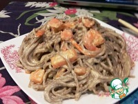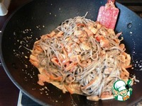 Когда рыба будет готова, перекладываем к ней готовую лапшу и заливаем всё соусом. Перемешиваем. |