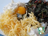 Смешиваем творог, свекольные листья, сыр (оставить совсем немного для посыпки), яйцо, чеснок. Добавляем манку, солим и перчим по вкусу. Перемешиваем. |