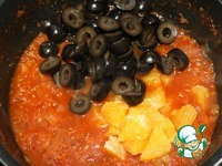 В соус добавим маслины, кусочки половинки апельсина и 1 зубчик мелко нарезанного чеснока, бальзамический уксус. Пару минут проварить, чтобы обменялось всё соками. |