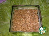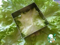 На блюдо выложить листья салата и установить квадратную форму для выкладки салата. |