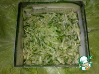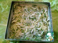 1 слой – выкладываем половину натертых огурцов. Края формы я выложила тонко нарезанными огурцами. |