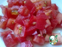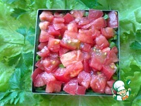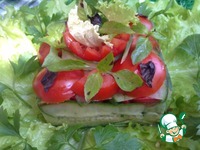 Уложив последний слой, украшаем салат тонко нарезанными огурцами и помидорами. Cверху придерживая пальцами помидоры, аккуратно снять форму. Легкий овощной салат готов. Угощайтесь! |