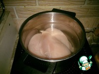 Моем и отвариваем куриные грудки. После того, как они сварятся, достаем и даем остыть. |